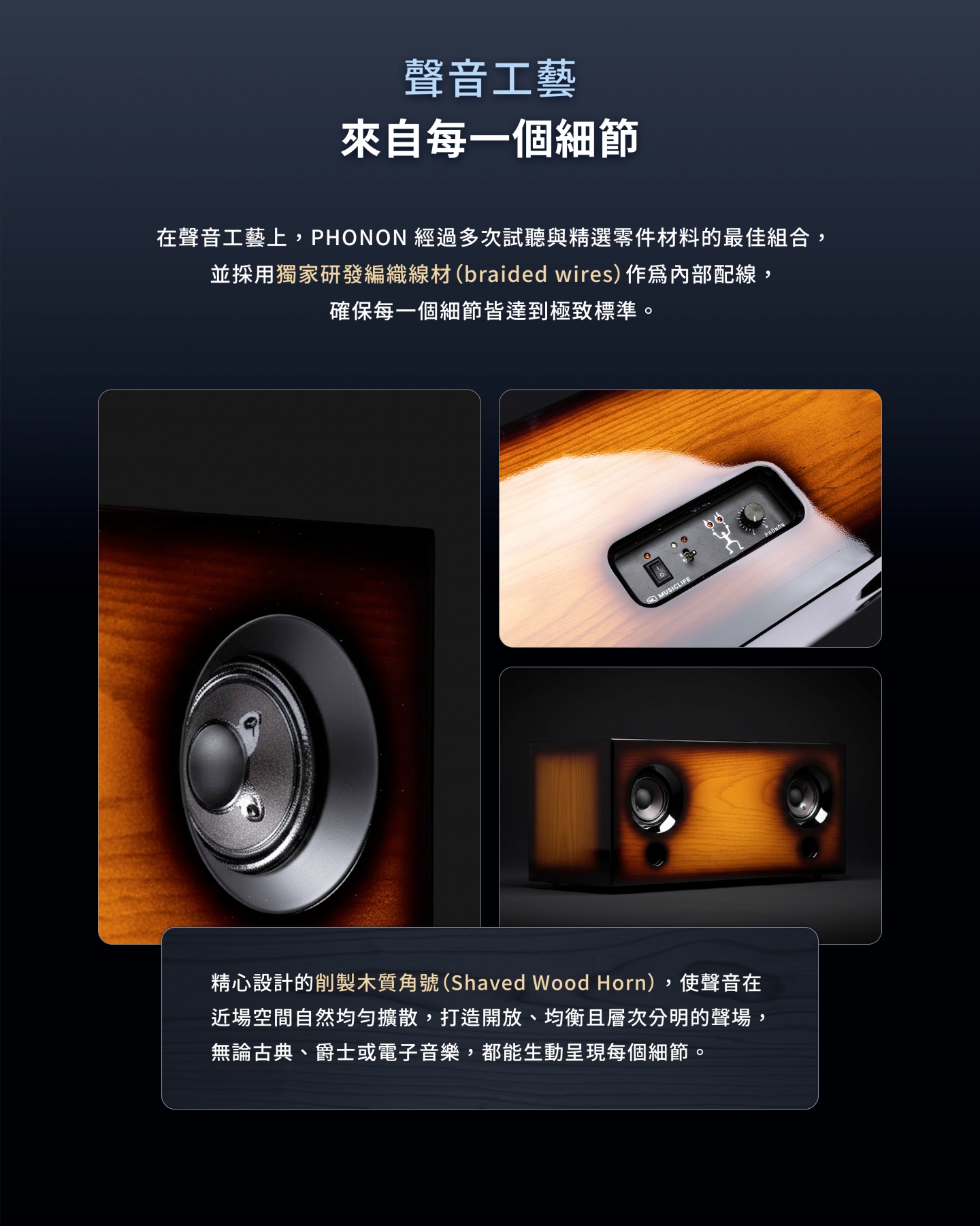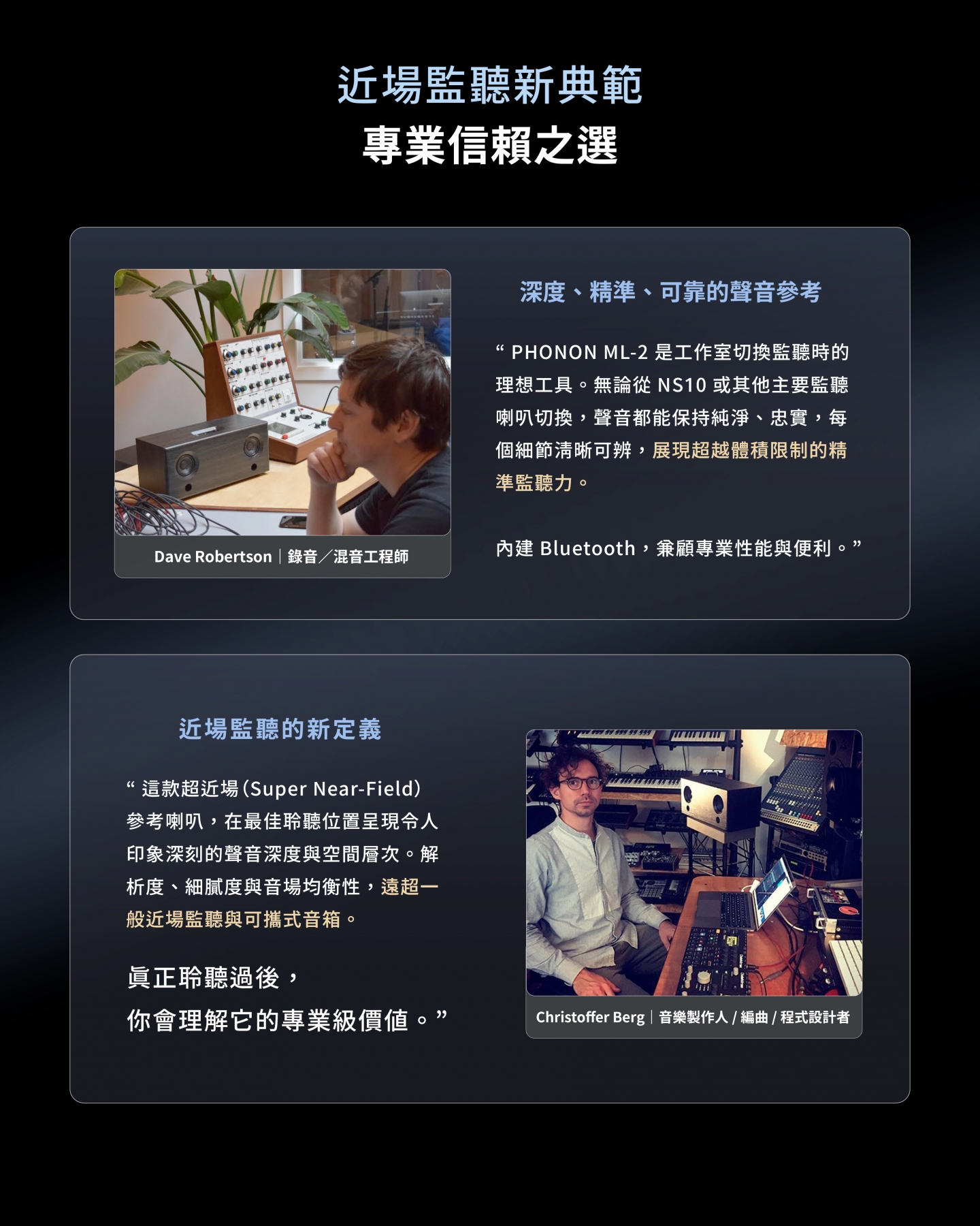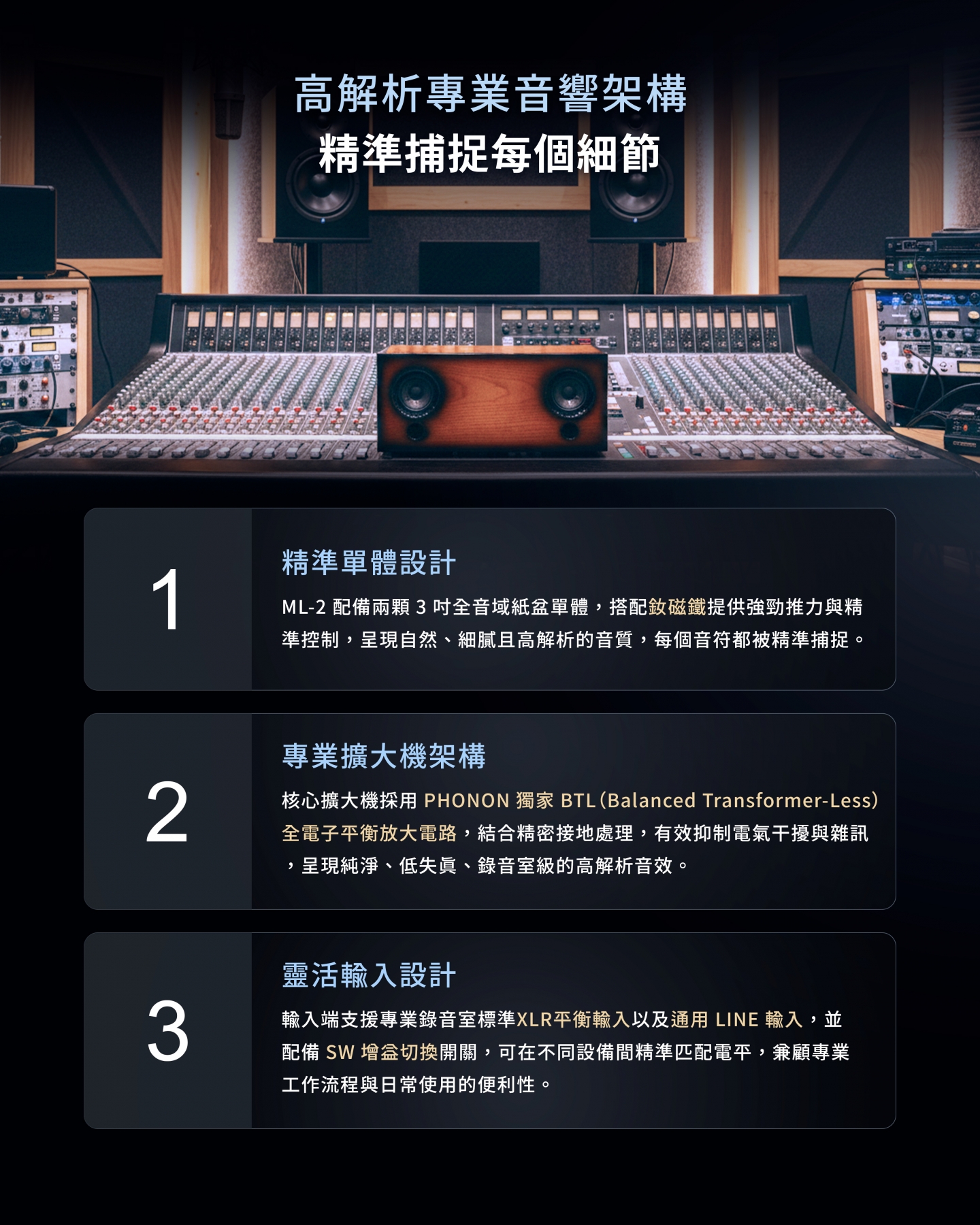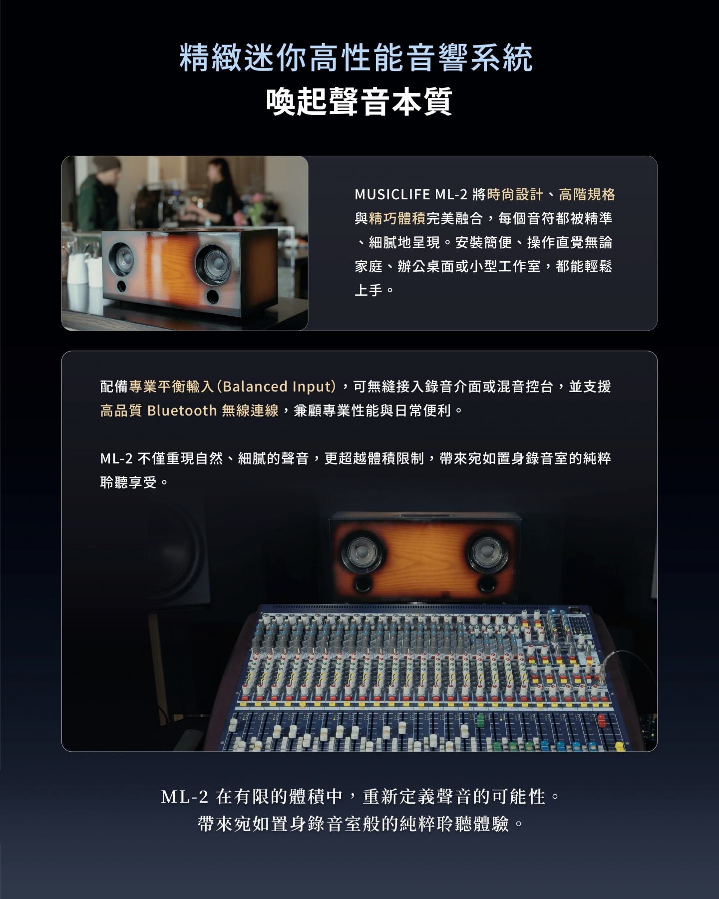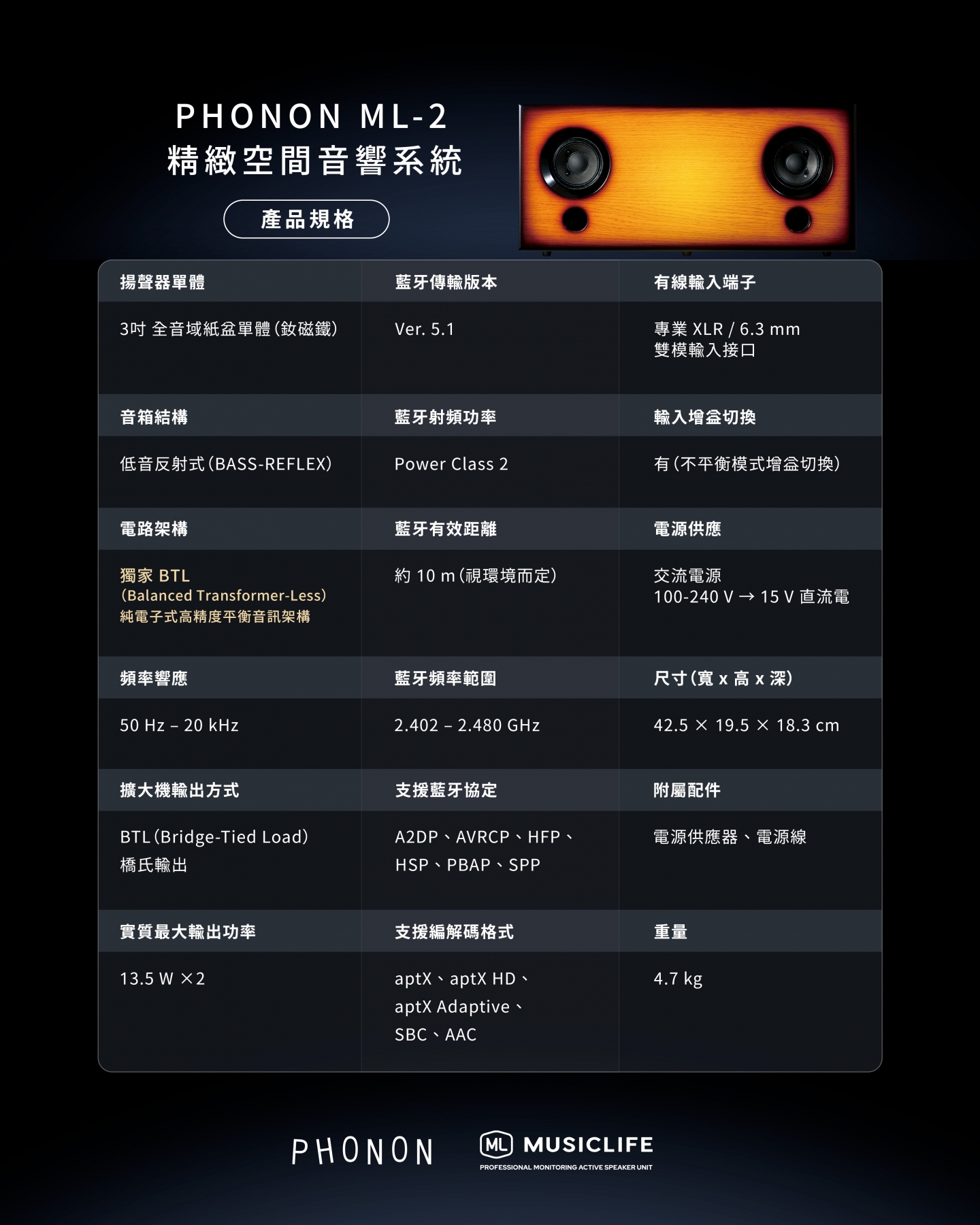 精巧體積的超近場專業高性能音響,使用純電子式高精度平衡音訊架構,由日本資深母帶後製工程師團隊共同研發。(支援藍牙無線播放功能)