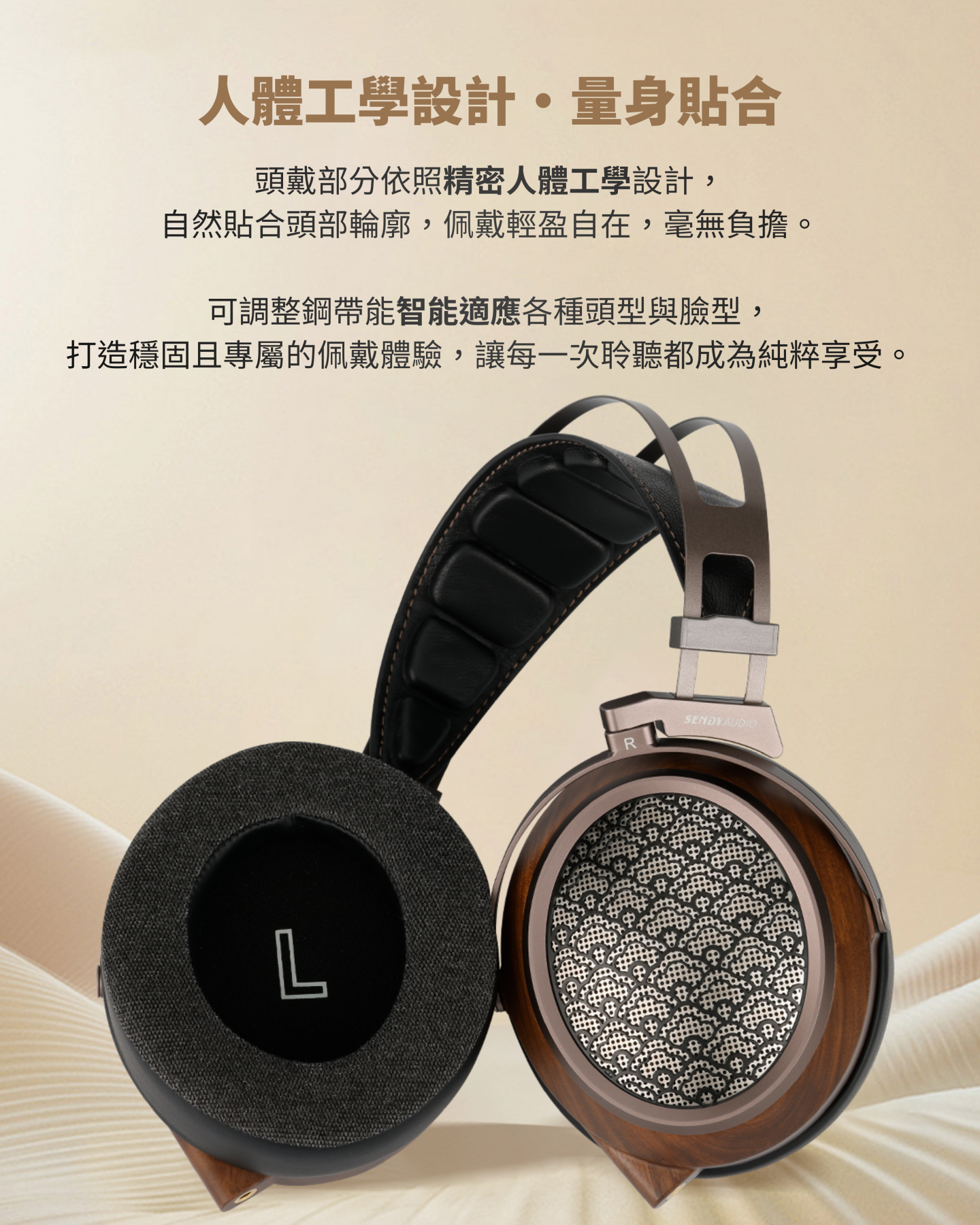 採用奈米級複合振膜與 EB 精密蒸鍍技術,多層複合導體精準重現豐富音場與細節層次;搭配高密度黑胡桃木耳殼與小山羊皮耳罩,結合人體工學與傾斜耳套設計,帶來舒適貼合佩戴感受,呈現極致音質與聲音純淨。
