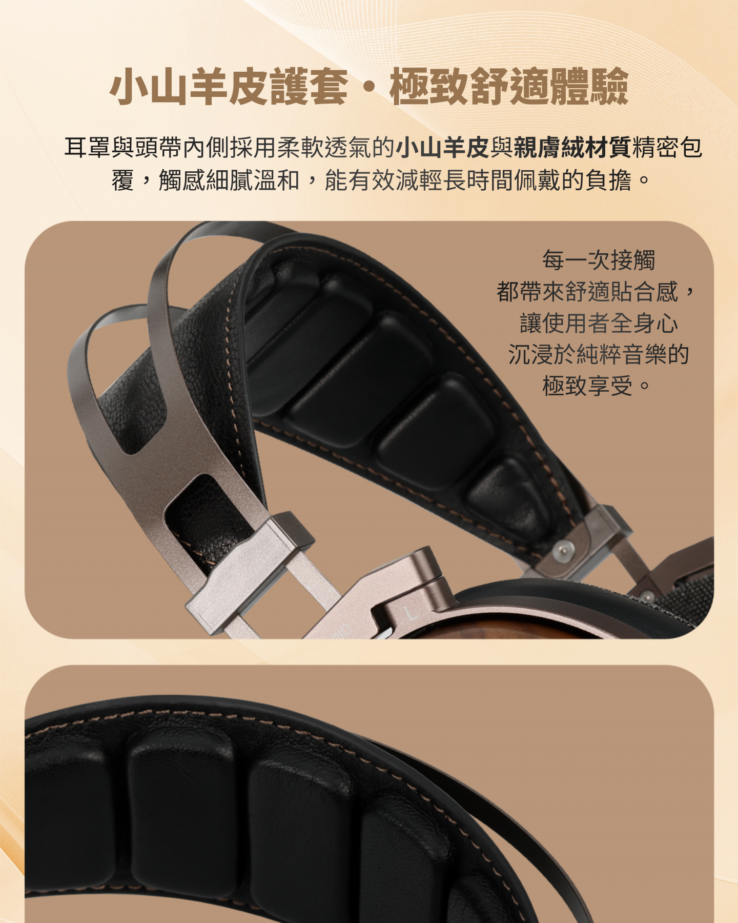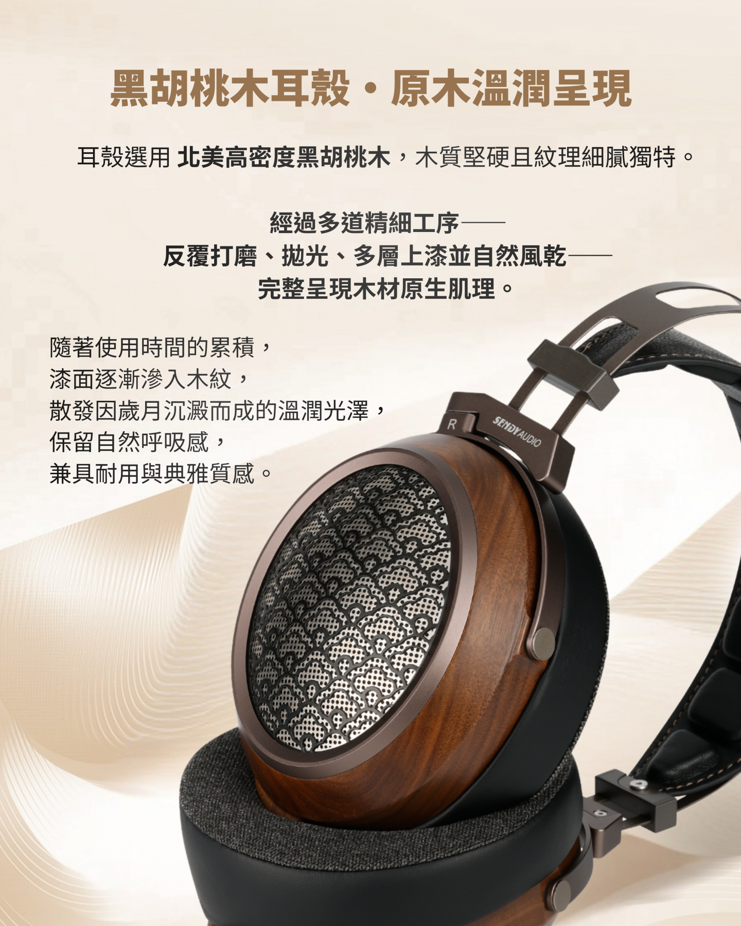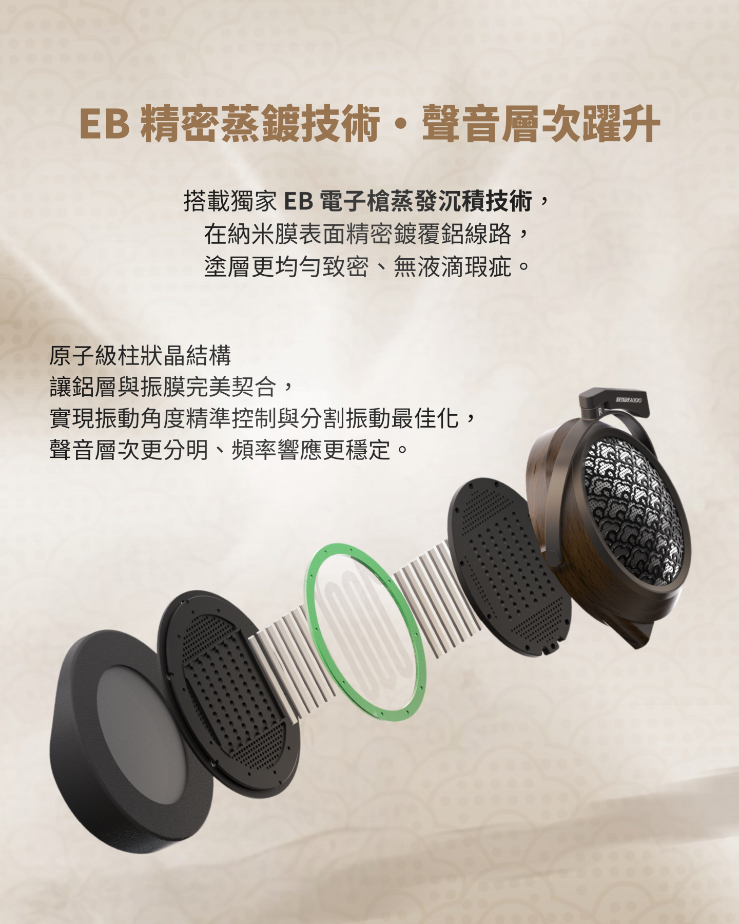 採用奈米級複合振膜與 EB 精密蒸鍍技術,多層複合導體精準重現豐富音場與細節層次;搭配高密度黑胡桃木耳殼與小山羊皮耳罩,結合人體工學與傾斜耳套設計,帶來舒適貼合佩戴感受,呈現極致音質與聲音純淨。